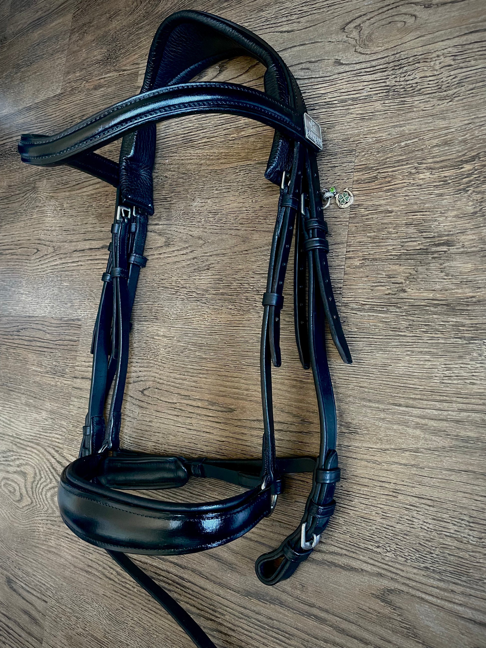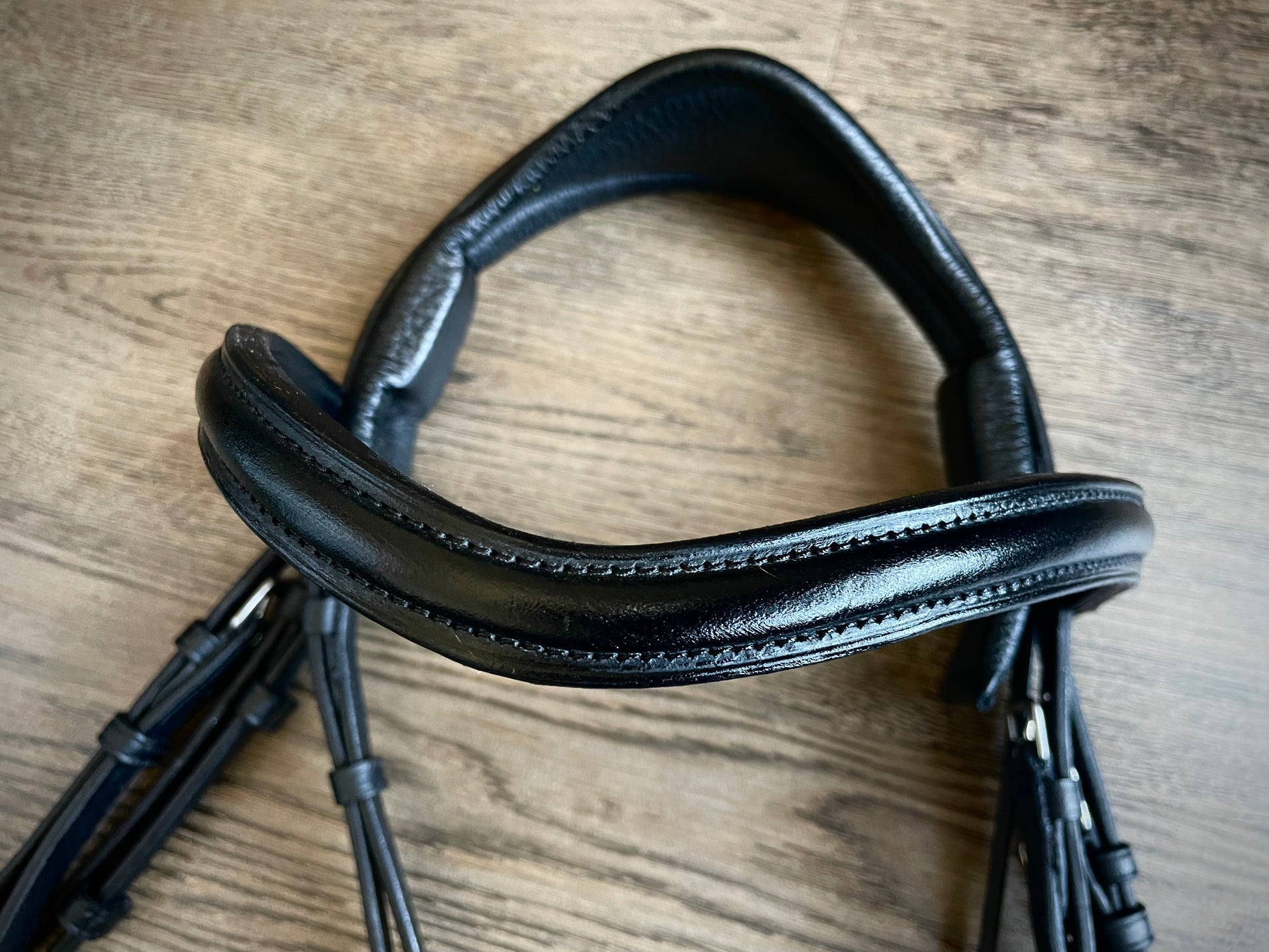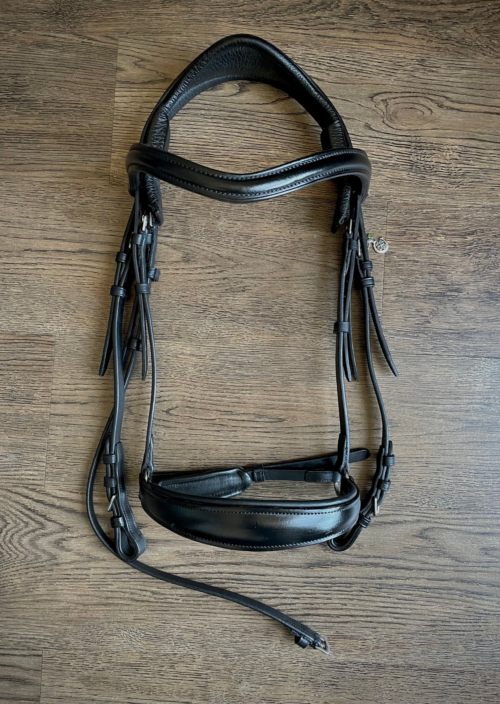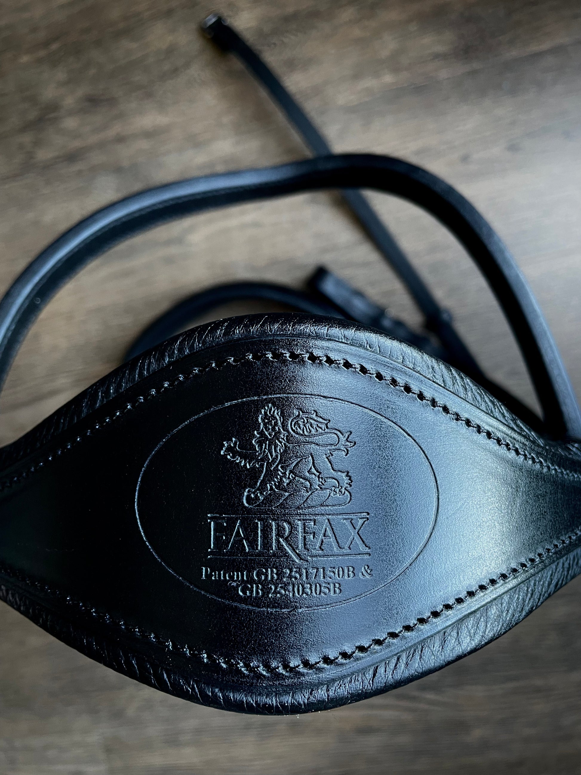 Bride de dressage (muserolle Allemande drop nose) Haut de gamme de marque Fairfax. Têtière large, ergonomique (plus grande surface de dispersion des tensions au niveau de la nuque) Design unique, alliant élégance, qualité irréprochable et durabilité.