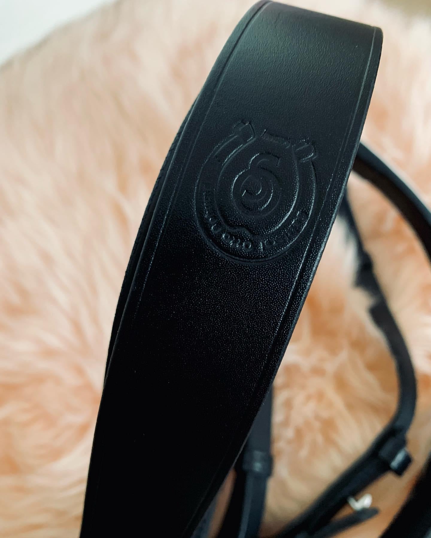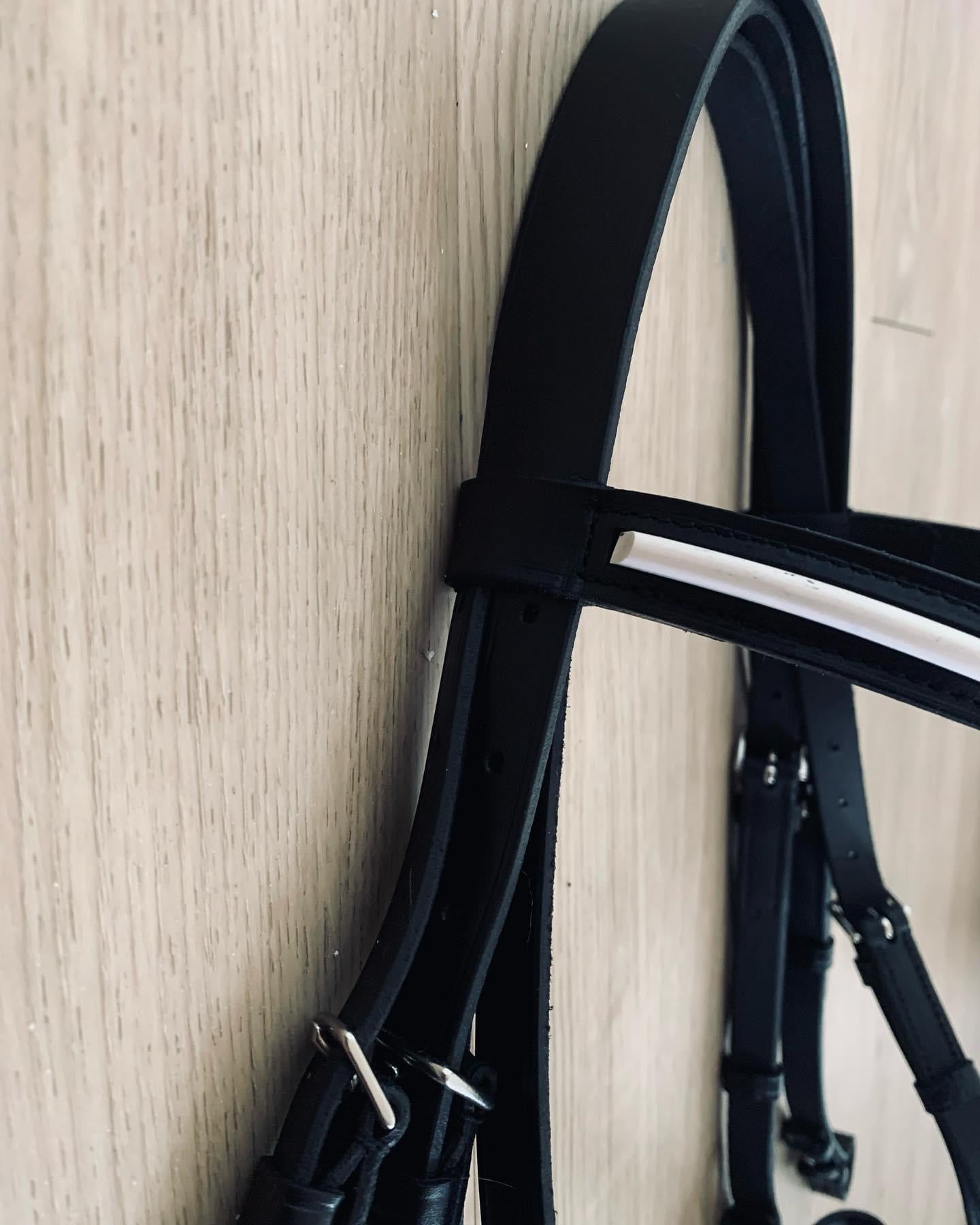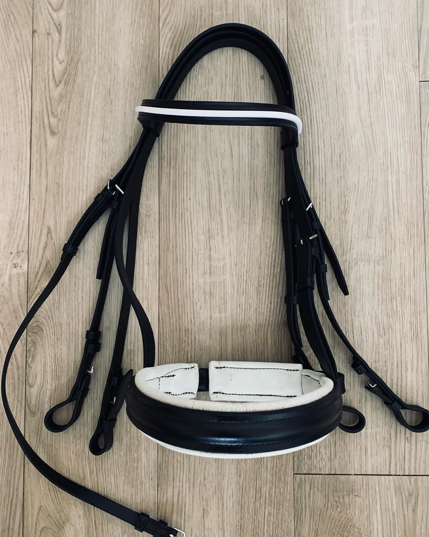 Bride de dressage double de la prestigieuse marque Otto Schumacher. Couleur noire et bordure blanche. Gr. Full (fait petite). Bride usagée en excellente condition. Bride seulement.