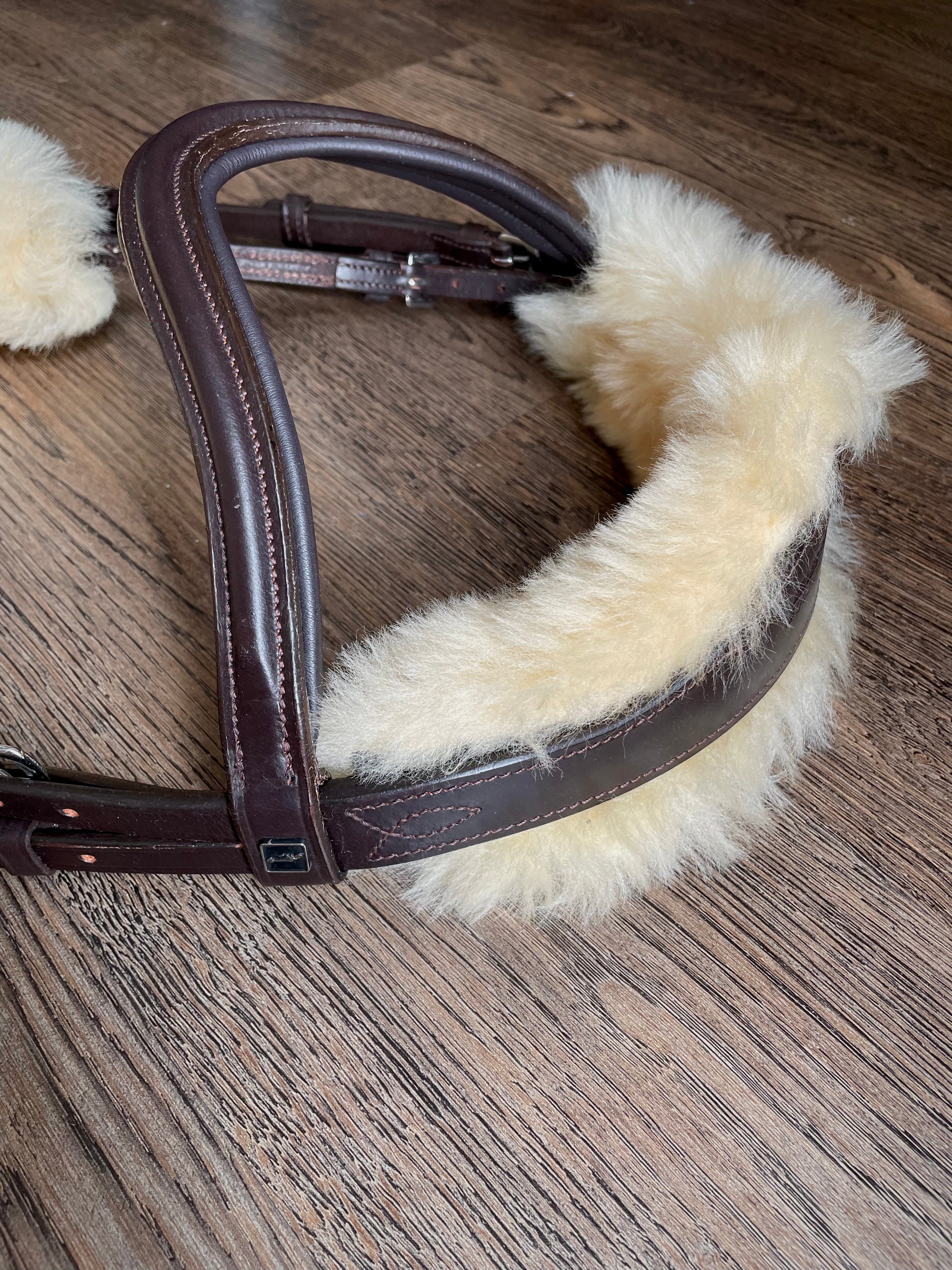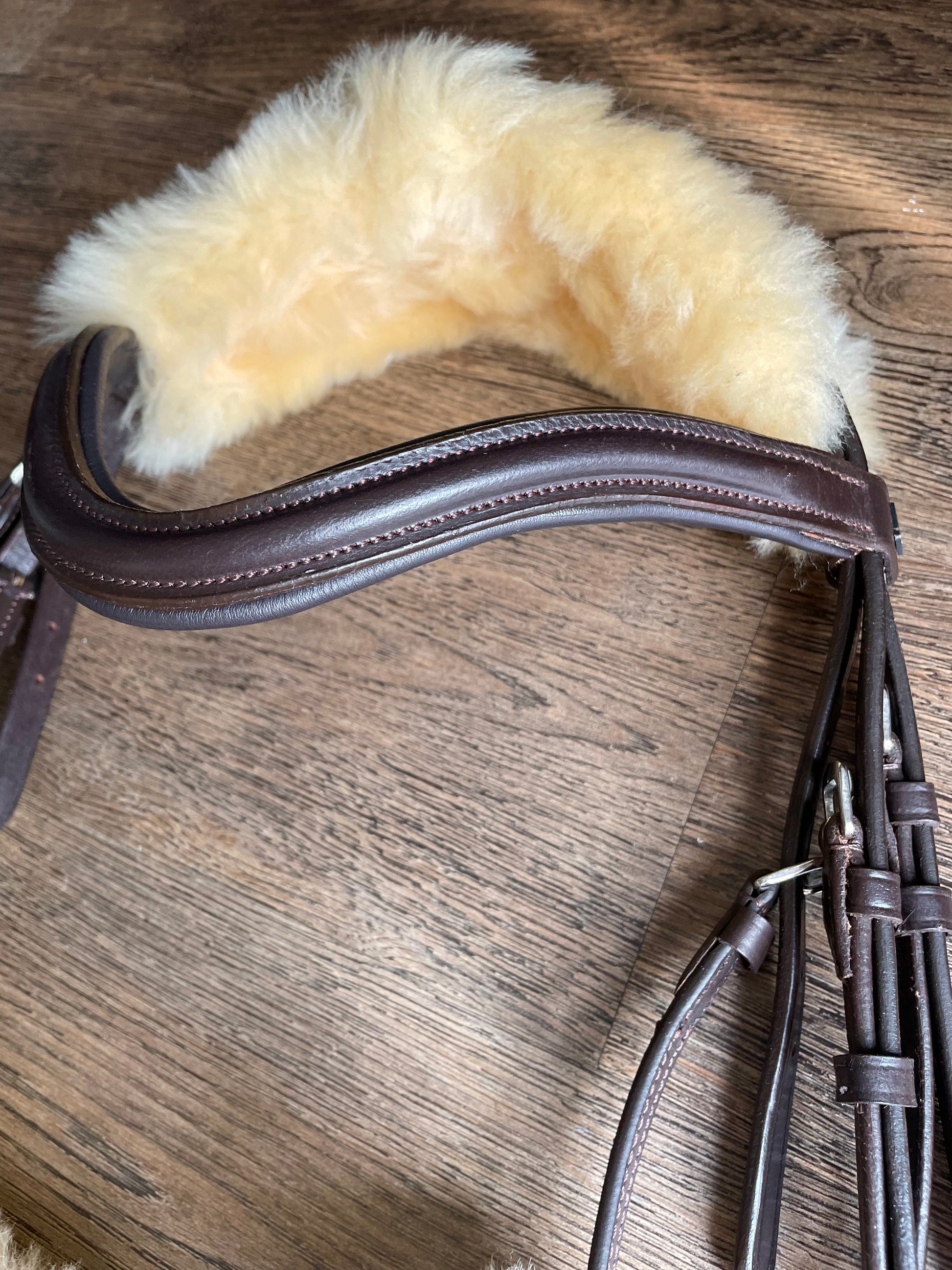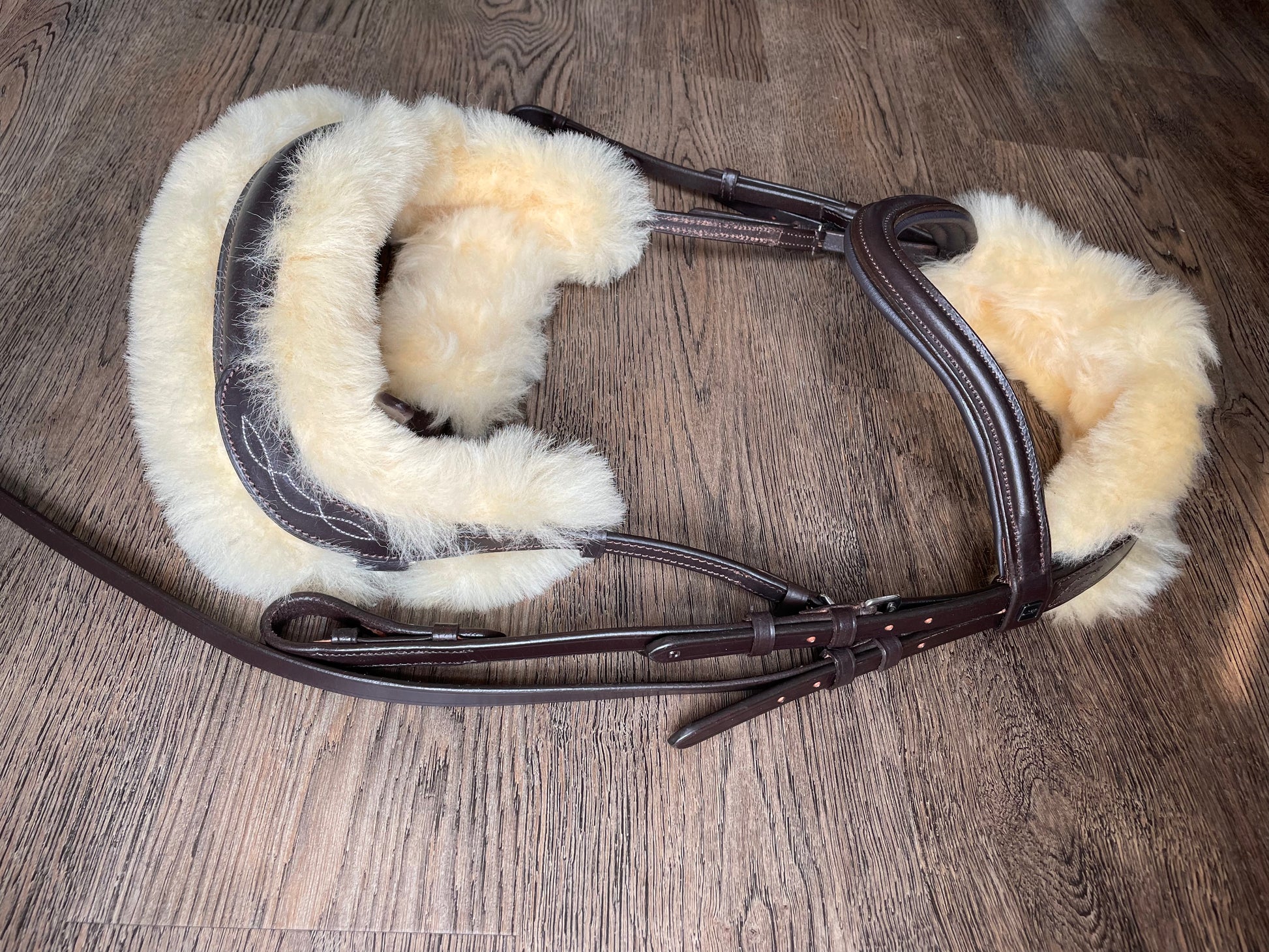 Bride ergonomique en cuir et vrai mouton (mouton détachable) Cuir brun Havana avec mouton naturel. Bride de qualité et parfaite pour les chevaux à la peau sensible. Marque Milestones Equestrian.