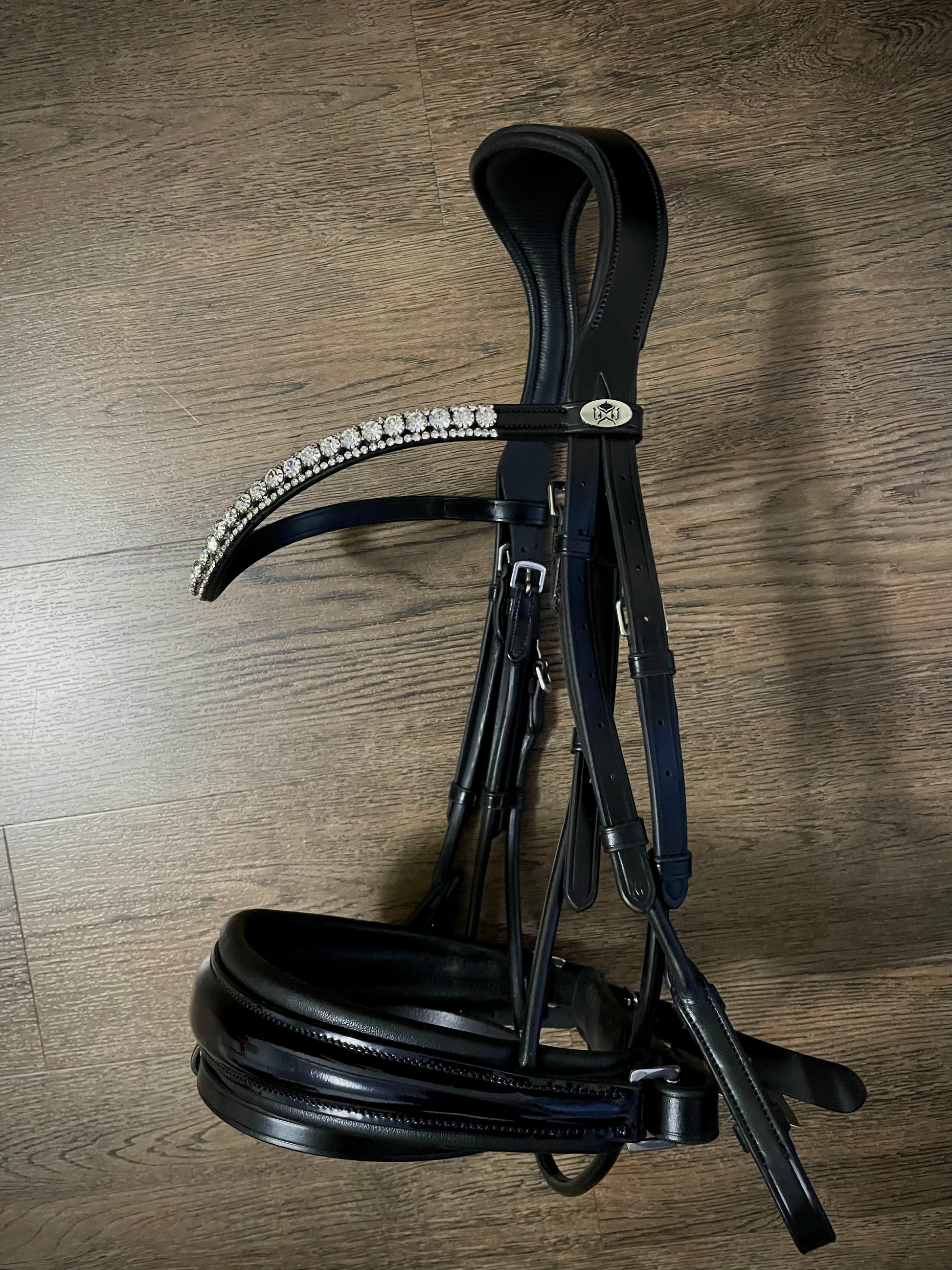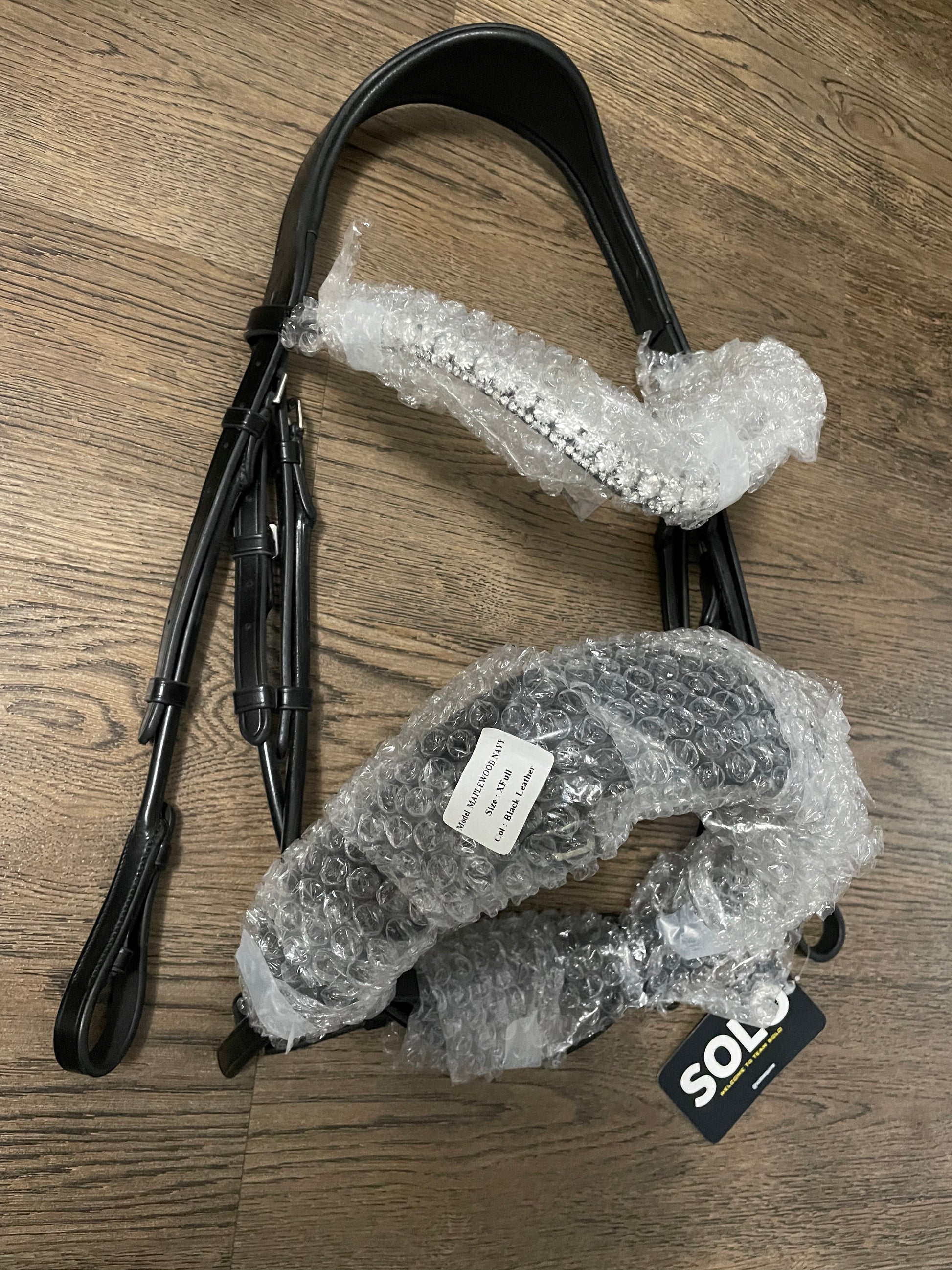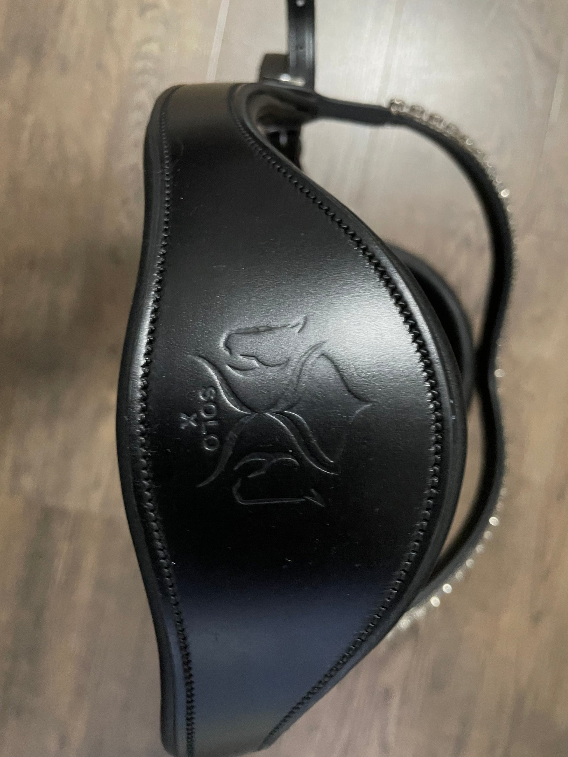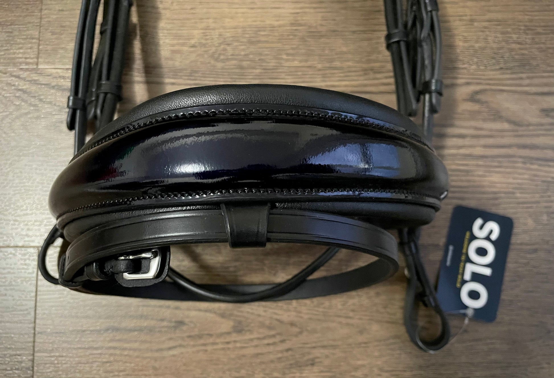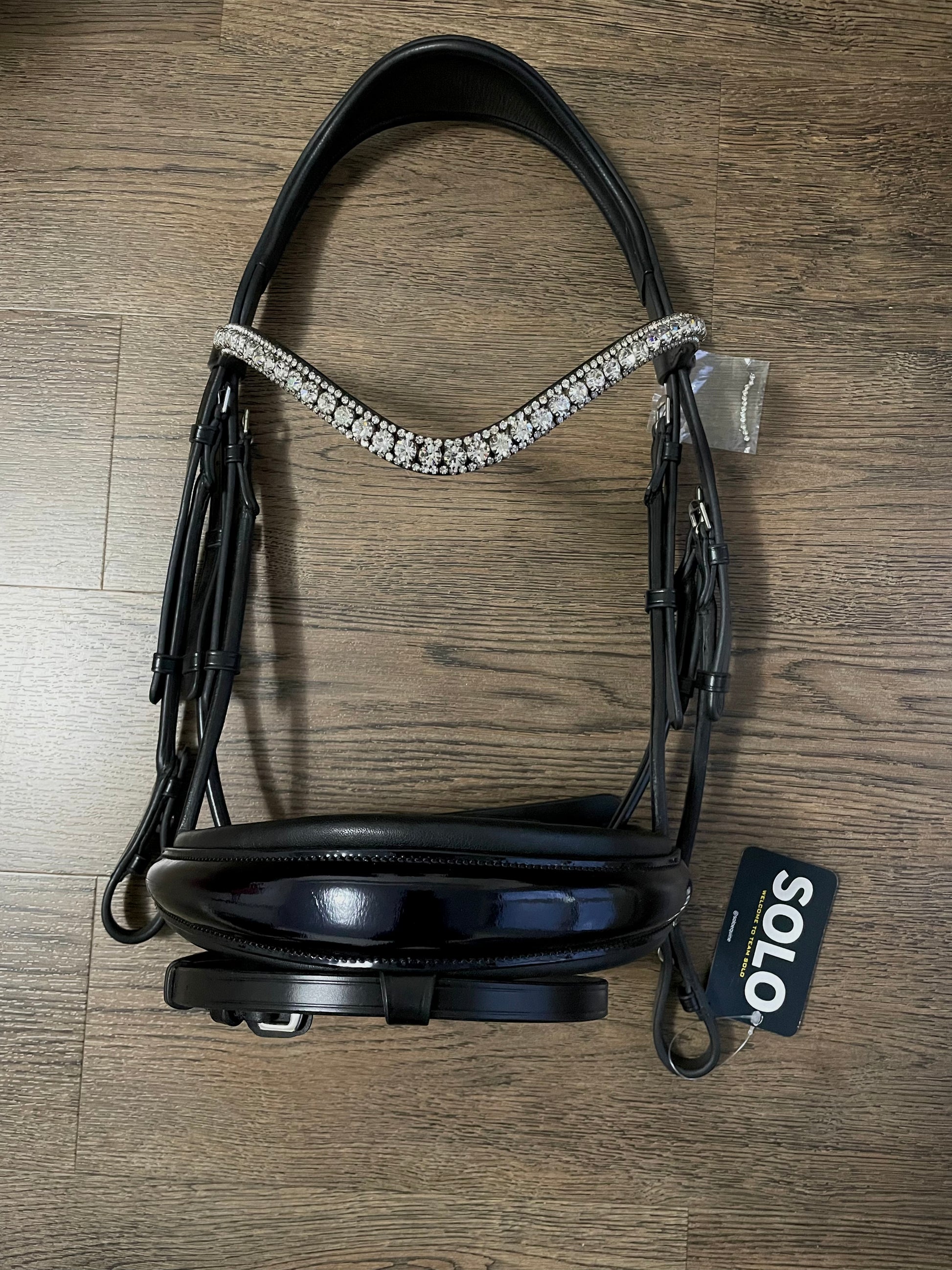 Bride dressage NEUVE par Solo Equine, modèle Maplewood Navy (subtils reflets navy dans le noseband au soleil) Bride de renommée pour sa qualité de cuir Italien.