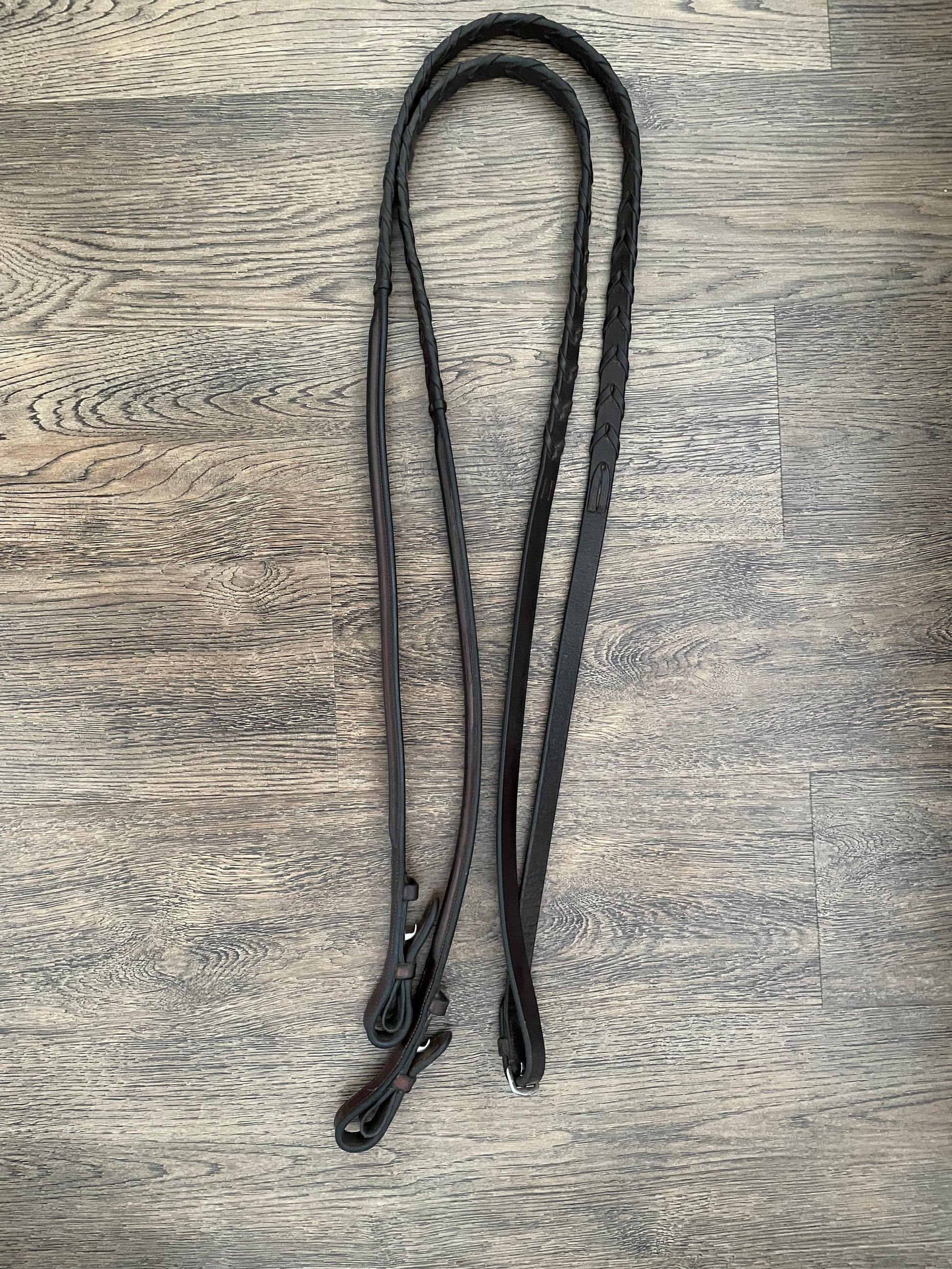 Rênes tressées en cuir, couleur oak brown avec surpiqûres beiges. En excellent état.