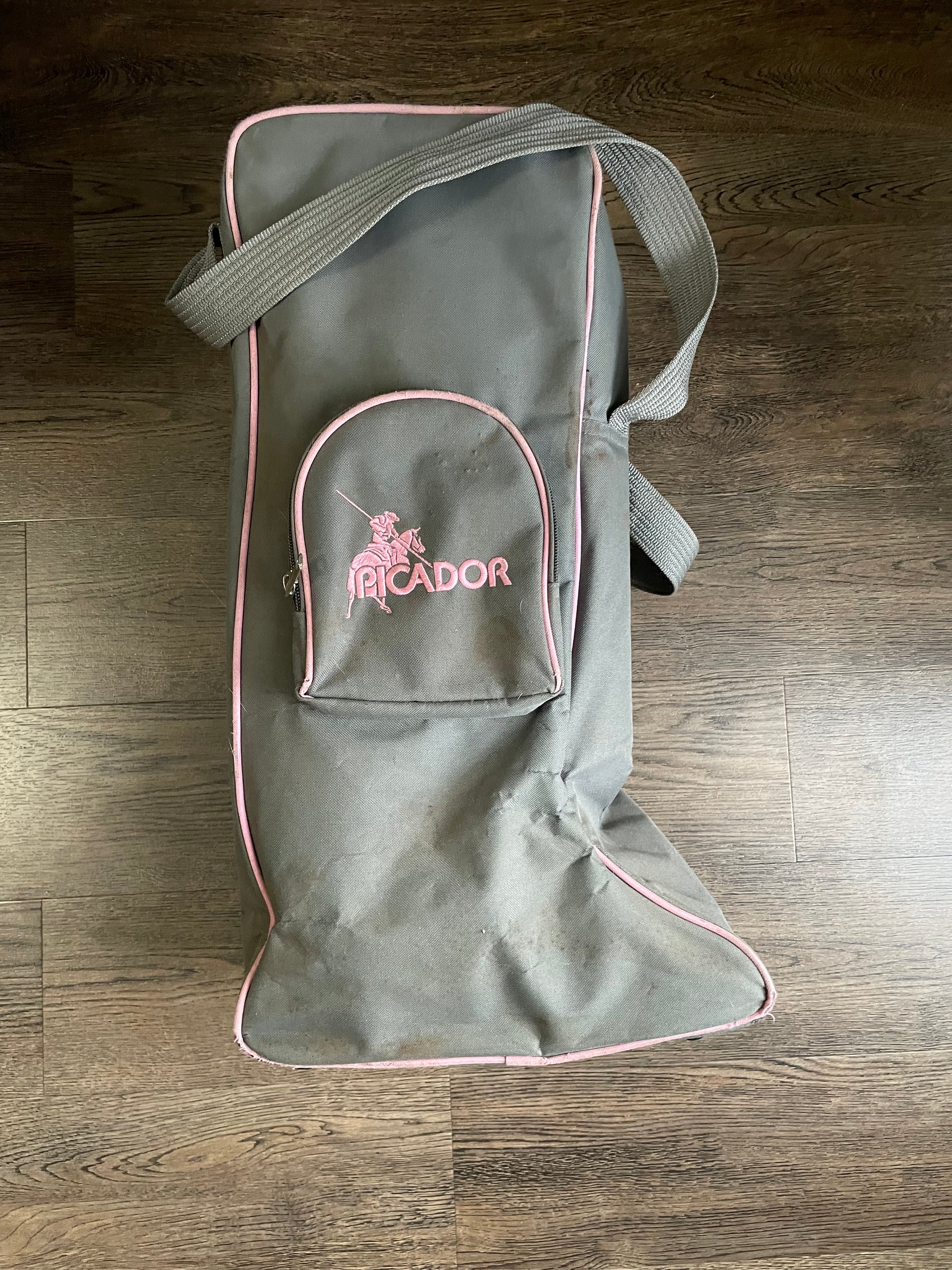 Sac de transport pour bottes, beaucoup d’espace et pochettes supplémentaires sur le côté. Gris et Rose. En très bon état